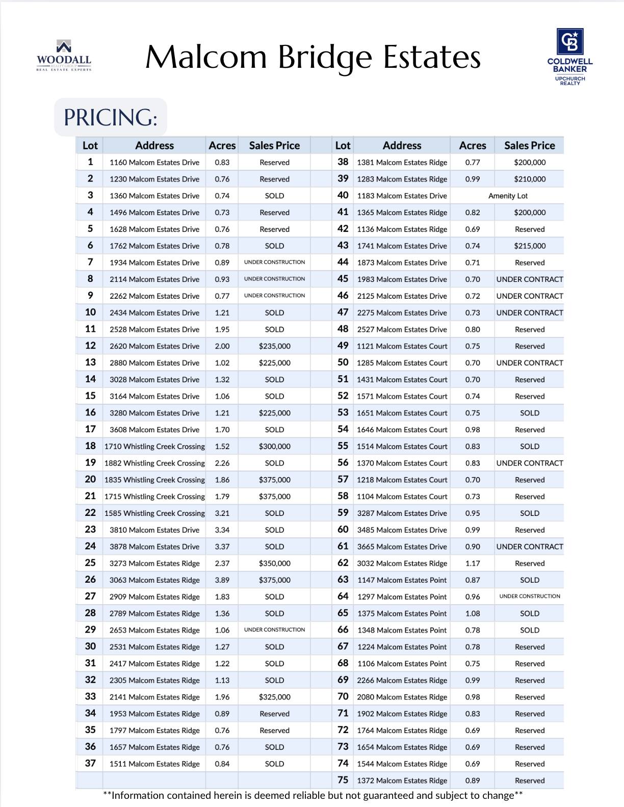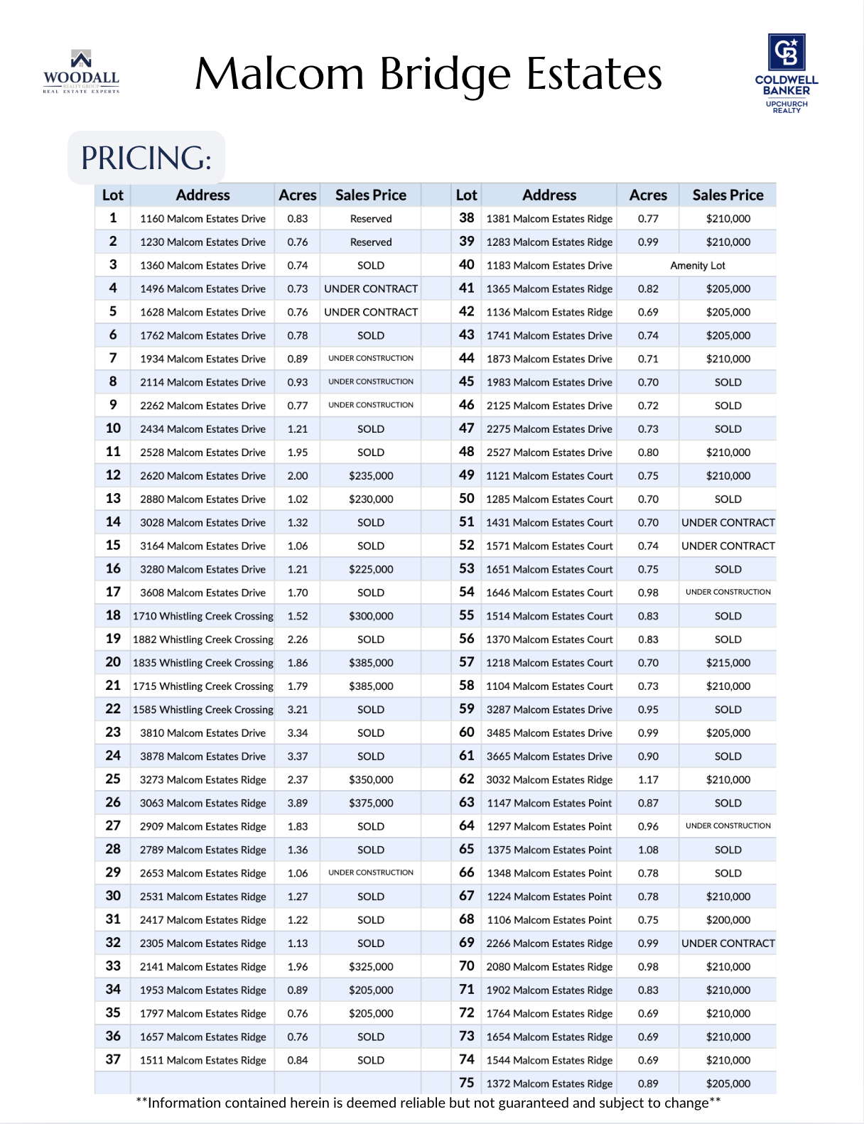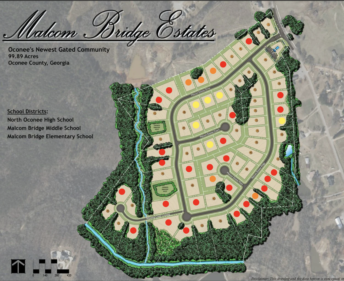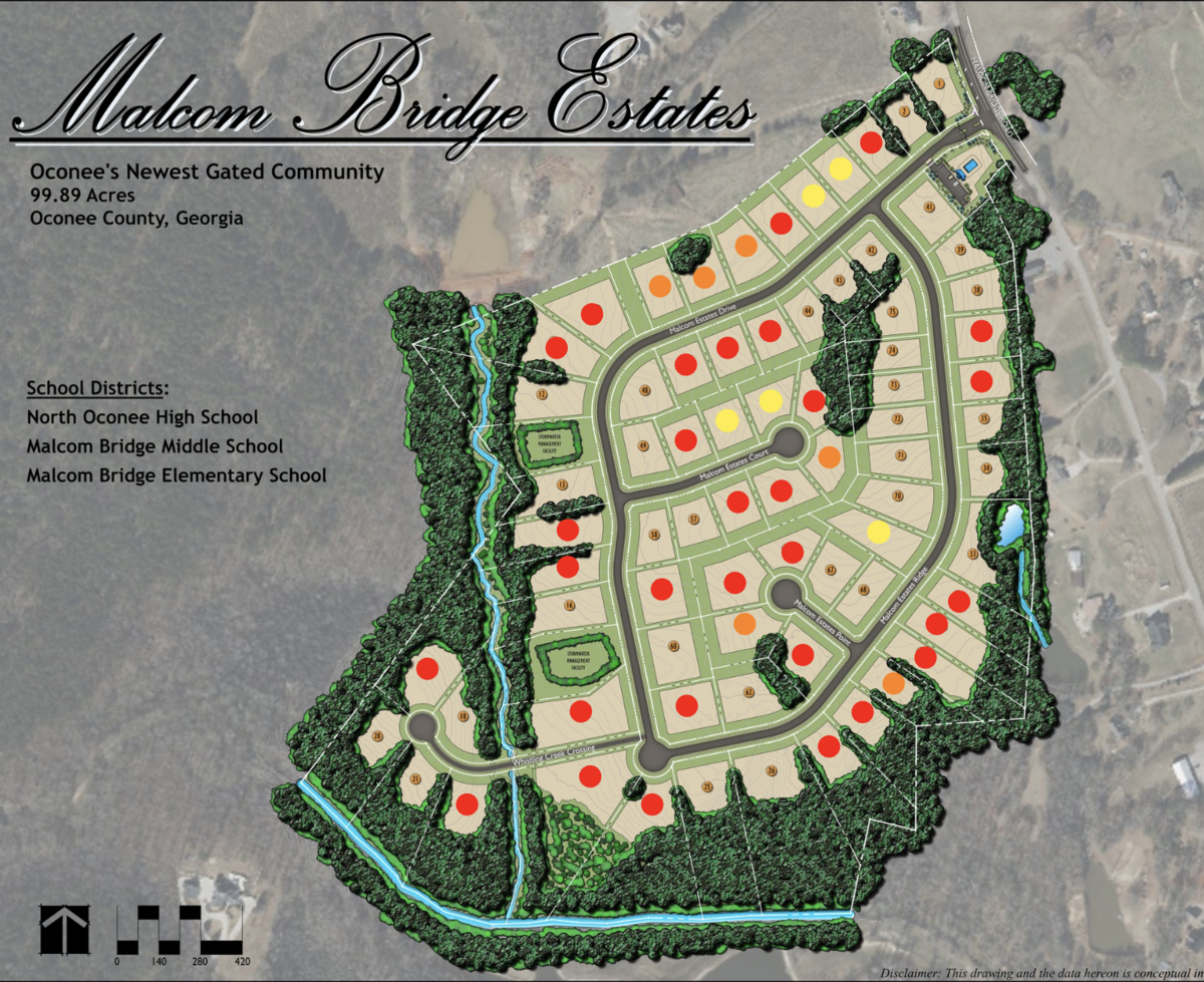 Malcom Bridge Estates is comprised of 74 lots on 99+ acres of rolling hills with many lots having beautiful creek frontage. Located in the heart of Oconee County with convenient access to Highway 316 and Epps Bridge, you can’t beat the location! The subdivision is zoned for North Oconee High School, Malcom Bridge Middle School and Malcom Bridge Elementary School.